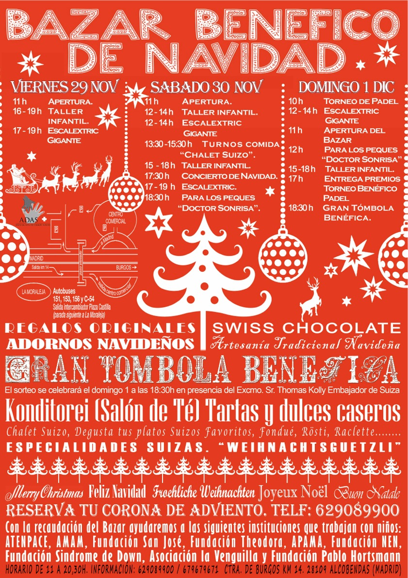 La Asociación de Damas Suizas (ADAS) celebra un año más el bazar benéfico navideño los días 29 y 30 de Noviembre y el 1 de Diciembre en el Chalet Suizo, km14 de la carretera de Burgos.