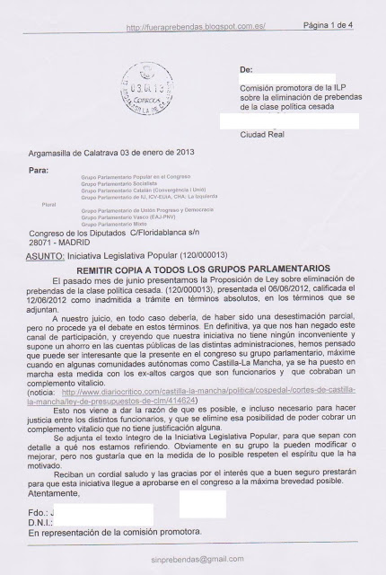 Redacción. En junio de 2012  la Mesa de la Cámara del Congreso de los Diputados decidió no admitir a trámite la Iniciativa Legislativa Popular (ILP) promovida por varios ciudadanos de Ciudad Real que  pedía la eliminación de prebendas de la clase política cesada. Aunque en un primer momento se estudió plantear un recurso ante el Tribunal Constitucional, no se consiguieron los recursos económicos necesarios para hacerlo en el plazo legal de tres meses. Por lo que finalmente han presentado el 3 de enero de 2013 esta iniciativa a los partidos políticos con representación parlamentaria para que sean ellos quienes lo hagan