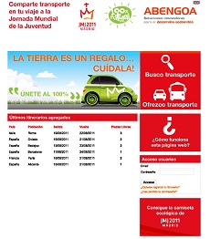 Redacción. Esta semana se ha lanzado la web para compartir transporte para ir a la JMJ (carpooling.madrid11.com), cuyo objetivo es poner en contacto a jóvenes que tengan espacio en su coche o autobús con otros que lo necesiten. “Esta sencilla aplicación permite reducir el número de medios de transporte: por tanto ser más ecológicos y favorecer el ahorro”, ha explicado Eva Latonda, responsable del proyecto de sostenibilidad 100% Natural. La web está especialmente dirigida a jóvenes procedentes de Europa y puede consultarse en español e inglés.