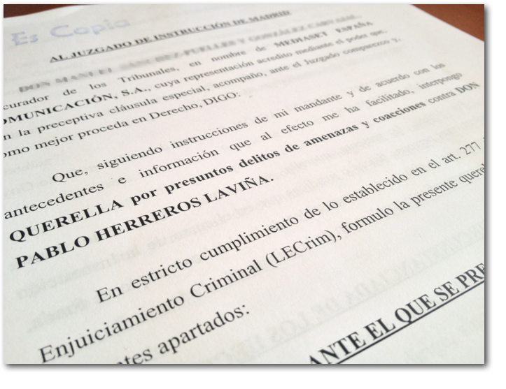Pablo Herreros. A diferencia de la mayoría de la gente, que vivió el Caso La Noria con alegría, yo nunca me reí. No me ha sorprendido recibir una querella de la empresa Mediaset España Comunicación S.A. (TeleCinco y Cuatro, entre otros), aunque sí que la interpusieran en julio, tanto tiempo después de aquello. La recogí este martes en el Juzgado de Instrucción número 14 de la Plaza de Castilla de Madrid, aunque curiosamente alguien ya se la había filtrado a El País, que publicó el lunes que testifico el próximo 4 de diciembre como imputado por amenazas y coacciones.