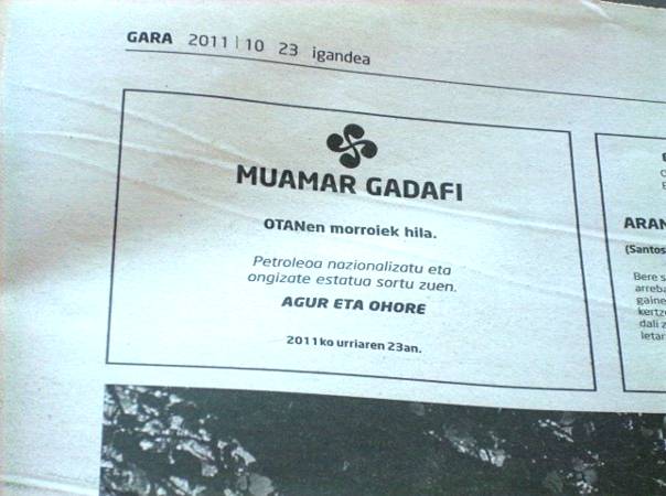 Rdacción. Esta esquela publicada en el GARA sobre la muerte de Gadafi. No sabemos quién la ha publicado, pero tras el lauburu (la cruz nazi-vasca), el texto dice "Asesinado por los esclavos de la OTAN. Nacionalizó el petróleo y creó el estado del bienestar. Adios y honor".