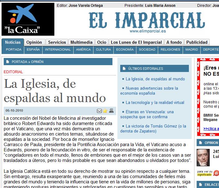 Redacción. Hemos recibido este correo electrónico con quejas por la línea editorial del periodico digital presidido por Luis María Anson. Denuncian que para el periodico de Ansón, la Iglesia está "de espaldas al mundo" y "mantiene posturas intransigentes y retrógradas".