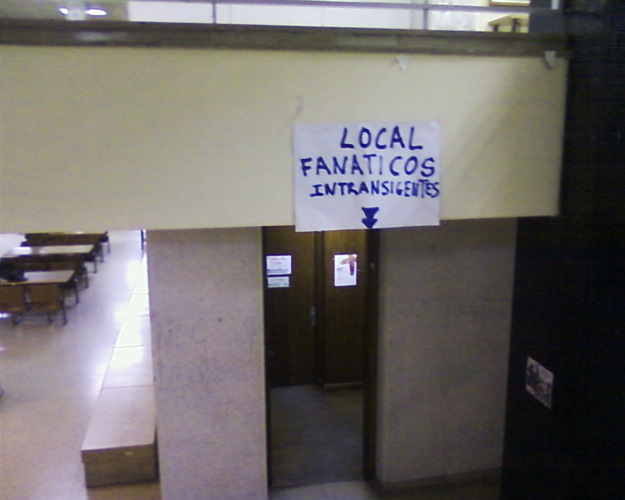 Otra foto de la campaña anticatólica, esta vez en la Facultad de Historia, tras los hechos de la capilla de Somosaguas. Lo que señala este cartel es la Capilla de la Facultad de Historia de la Complutense.