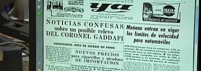Es la portada del YA del 7 de abril de 1974. Los temas son los mismos del pasado fin de semana. Casi cuarenta años atras ya estaba Gadafi haciendo de las suyas y todos los demás temas coinciden. Incluso, que el Real Madrid y el Juventud jugaran. Increible.