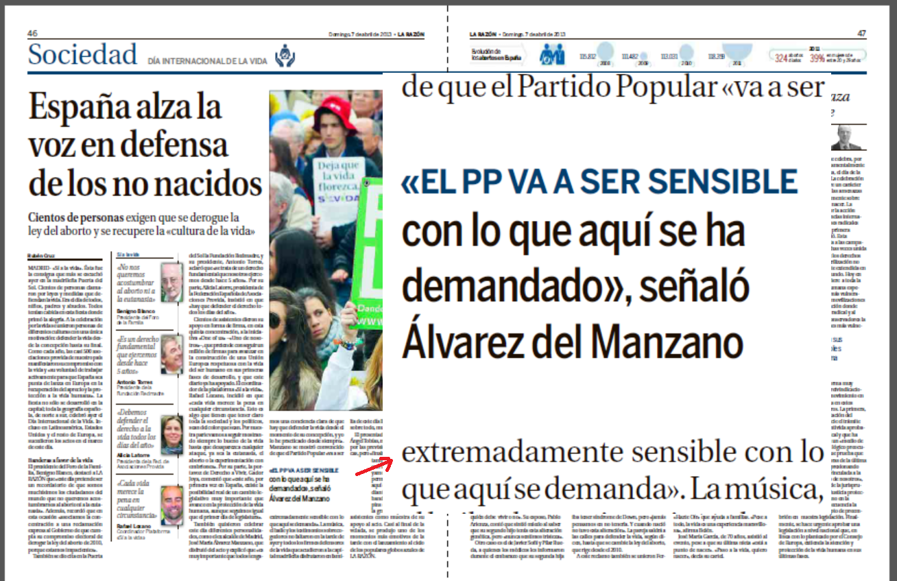 De nuevo, como en ocasiones anteriores, la manifestación "provida"en vez de atacar a los responsables actuales del aborto, que no son ni Witiza ni Espartero, sino el Partido Popular sirvió de para hacerle publicidad. La frase destacada de la doble página no es que los convocantes de la concentración denunciaban que bajo la mayoría absoluta del PP ya había sido asesinados más de 120.000 niños por aborto quirúgico y cientos de miles más por aborto químico, sino que «El PP va a ser sensible con lo que aquí se ha demandado".